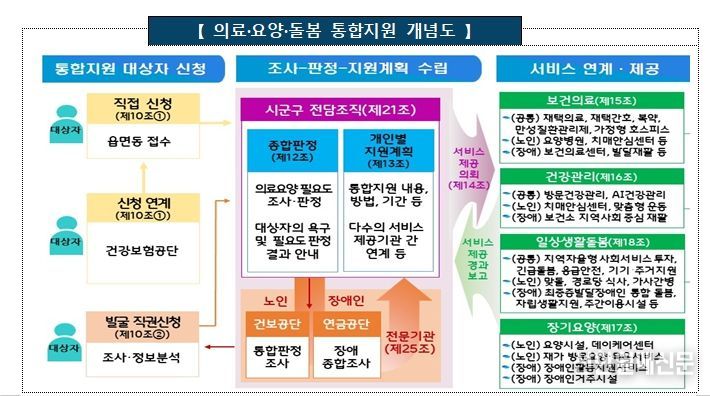 이러한 환경변화 및 요구에 대응하기 위해, 정부는 시범사업 등 통합돌봄의 제도화를 추진해 왔으며, 일상생활 수행에 어려움을 겪는 사람이 살던 곳에서 건강한 생활을 영위하도록 의료·요양·돌봄 서비스를 통합·연계하는 '의료·요양 등 지역 돌봄의 통합지원에 관한 법률(돌봄통합지원법)'이 ’24년 3월 제정되어 내년 3월 전국적인 본사업 시행을 앞두고 있다.