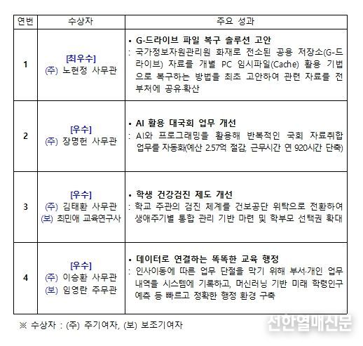 ‘우수’ 수상자인 ▲장명헌 사무관은 인공지능(AI)과 코딩을 활용해 국회 요구자료 관리 체계(시스템)를 자동화함으로써 2.57억 원의 국가 예산을 절감하고 연간 920시간에 달하는 업무 시간을 단축하는 것으로 추산된다. 앞으로 이러한 운영체계를 다른 부처에서도 활용할 수 있도록 확산하여 정부의 업무 생산성을 높이는 데 노력하겠다고 밝혔다. ▲김태환 사무관은 건강보험공단 위탁 형태의 학생 건강검진 제도개선 시범 사업을 2차례 안정적으로 추진하고, 이를 전국 모든 학교로 확대할 수 있는 기반을 마련했다. ▲이승환 사무관은 문서에 머물던 업무 정보를 체계적으로 정리하고 흩어진 교육자료(데이터)를 하나로 연결하여, 불필요한 행정력 낭비를 줄이는 등 자료(데이터) 기반 행정 혁신에 기여했다. 앞으로 국민과 직원들이 보다 편리하게 ‘교육데이터맵’을 활용할 수 있도록 정보를 관리하고 다른 부처와도 협력해 나갈 예정이다.