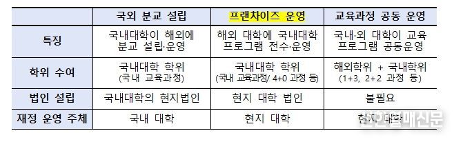 교육부는 그간 대학의 해외 진출을 지원하기 위해 관련 규제를 정비해 왔다. 기존의 사전 승인 중심 운영체계를 개편하여 대학 간 협약을 기반으로 프랜차이즈 운영이 가능하도록 개선하고, 교육과정 구성과 수업 운영은 대학 자율로 정하도록 하여 실행력을 높였다. 이번 사례는 이러한 제도 개선의 결실이며, 국립대학으로는 첫 번째이다.
